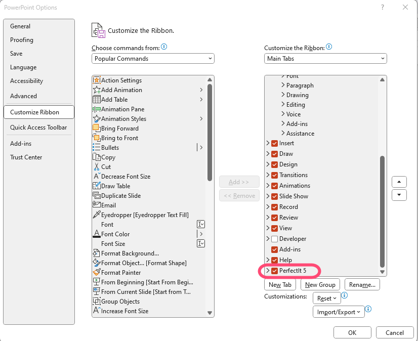 If you do not use or have access to PerfectIt for PowerPoint with your license, you can hide it from the Ribbon in PowerPoint, so it does not appear.