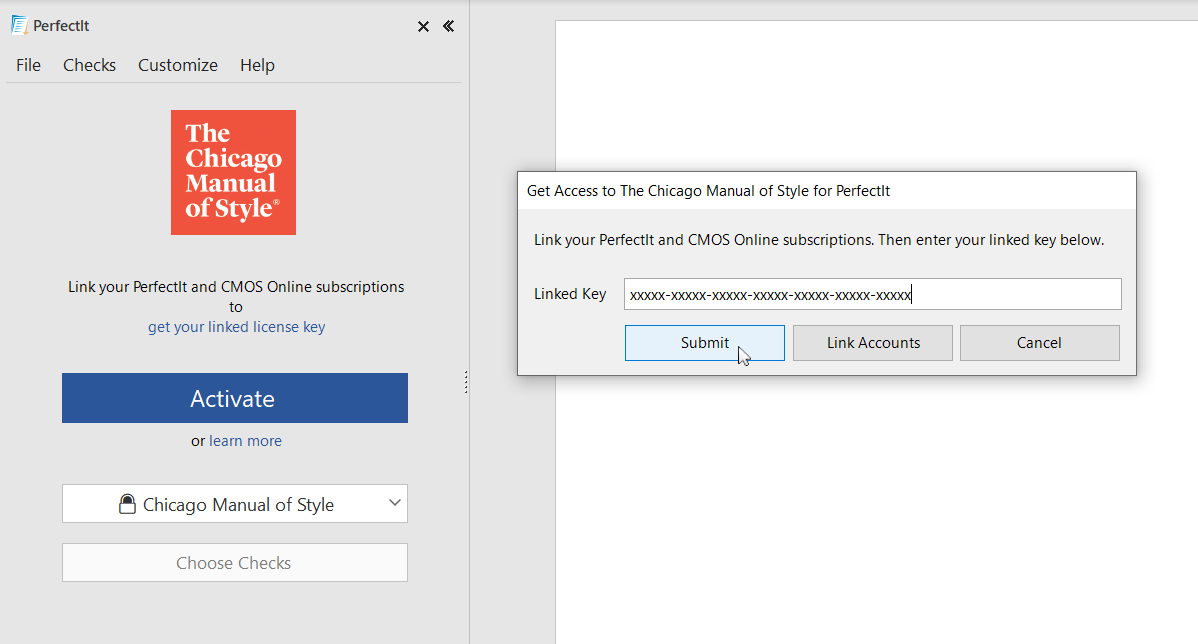 Once you have your Linked License Key, open Word and click on the PerfectIt 6 tab. Launch PerfectIt and select Chicago Manual of Style from the Styles dropdown. Click Activate.