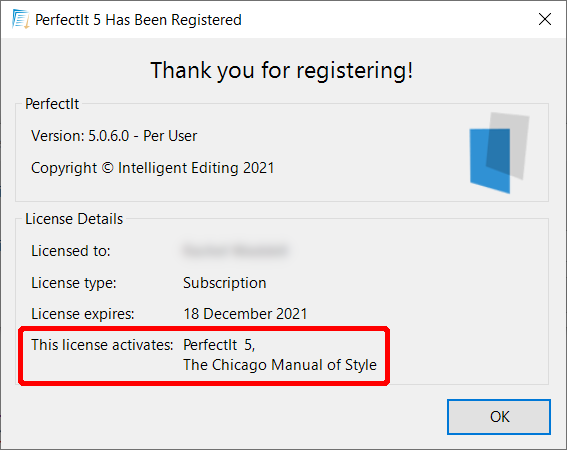 The registration confirmation screen shows that The Chicago Manual of Style for PerfectIt has been activated.