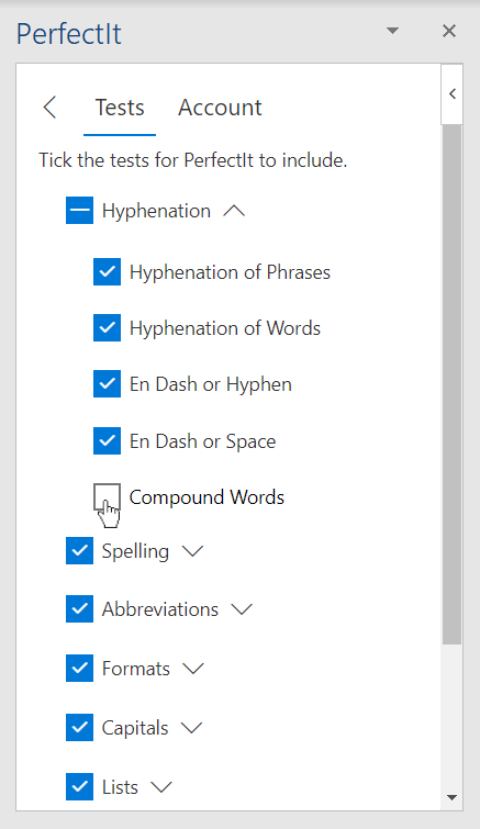 This image shows the Checks list that appears. Tick the boxes to select the checks that you want PerfectIt to include. Please note, subchecks are not displayed in the list.