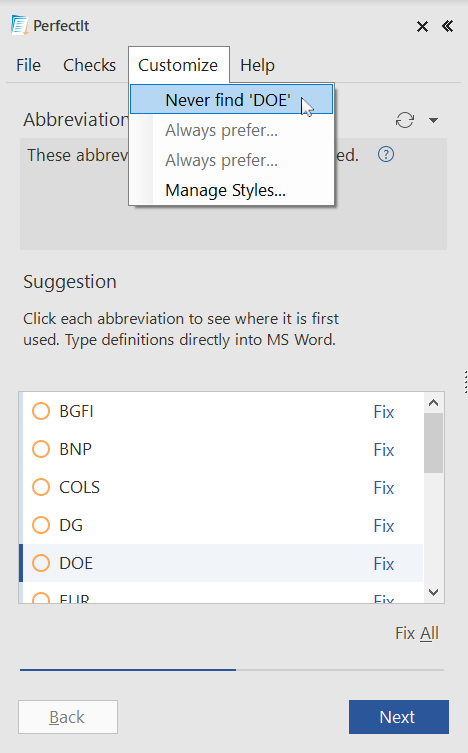 Checking with PerfectIt is very fast. However, as with any software checker, you need to check PerfectIt’s suggestions carefully, because sometimes the identified ‘issues’ are actually correct. For example, for people who work at the Department of Energy (DOE), it might be appropriate to use ‘DOE’ without ever defining it. However, PerfectIt will pick this up as an issue when it runs the check for abbreviations that have not been defined. By clicking on the Customize menu and selecting Never find ‘DOE’, it is possible to teach PerfectIt to ignore this ‘issue’. As you teach PerfectIt to ignore certain words or phrases in this way, it becomes more accurate and saves you even more time.