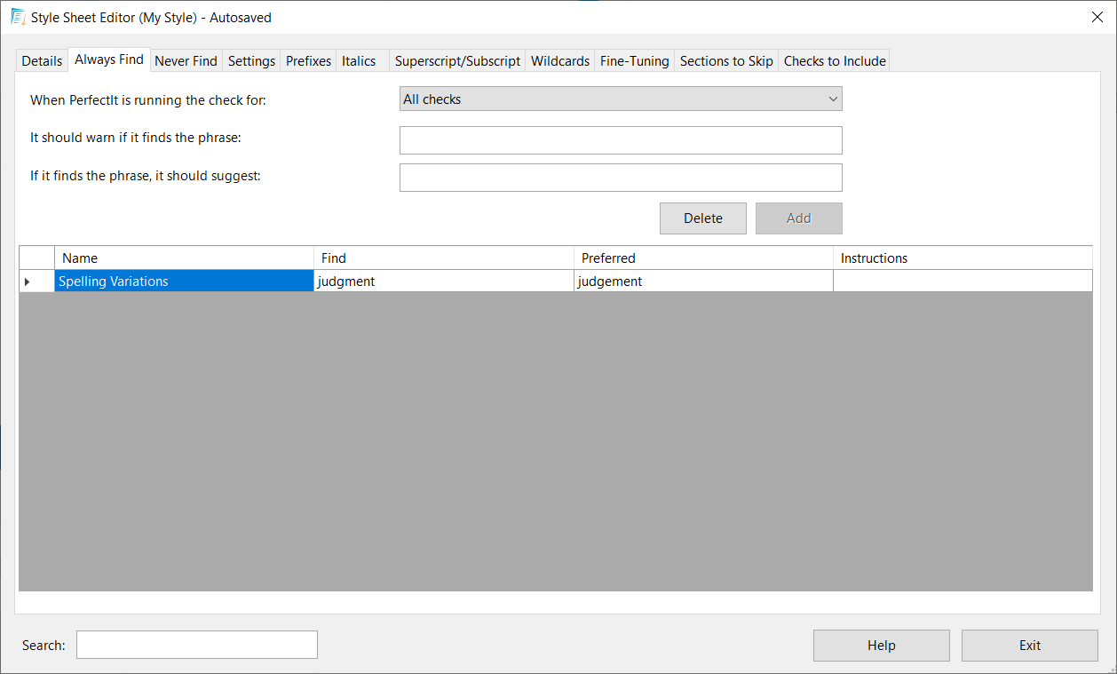 The list of items that PerfectIt will always check (‘judgement’ in the example above) can be found in the Always Find tab, and the list of items that PerfectIt will ignore (‘DOE’ in the example above) is in the Never Find tab. More guidance on how to build lists like these is available in Always Find and Never Find.