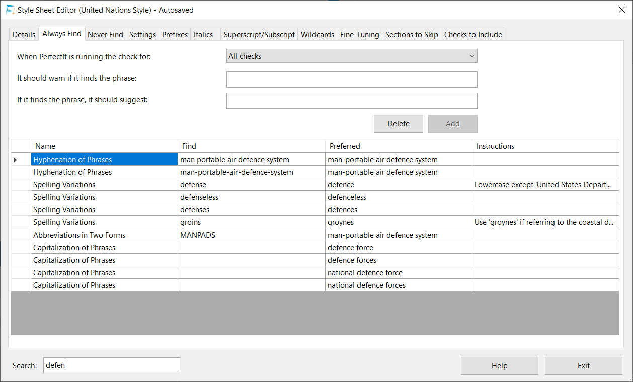 If you want to find a particular item, you can use the Search box that is located at the bottom of some tabs in the Style Sheet Editor. PerfectIt will filter the currently displayed rows as you type in the Search box.