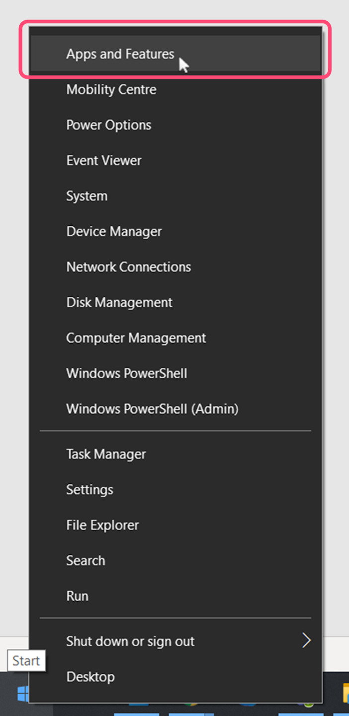 Close any Office applications you have open. Right-click on the Start button and select Apps and Features.
