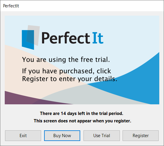 You have options to ‘Buy Now’, ‘Use Free Trial’ or ‘Register’ PerfectIt.