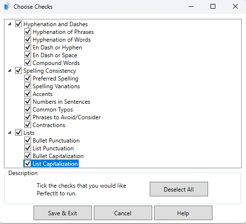 If you want to find out more about each check, there is an overview in Features: The Checks, and each check is covered separately in Understanding PerfectIt’s Checks.