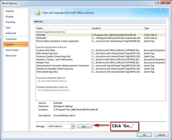 If you've tried restarting and re-installing and you still can;t see the PerfectIt icon, then in Word 2007/2010/2013/2016/2019/2021, click the 'File' tab. Then choose 'Options'. Then choose 'Add-Ins' from the left-hand side. You should see a list of all add-ins and PerfectIt should be there. If it's working correctly, PerfectIt should be in the 'Active Application Add-ins' section of that list. If it isn't there, find the drop-down menu at the bottom of the screen. It should say 'Manage: COM Add-ins'. Press the 'Go…' button next to that.