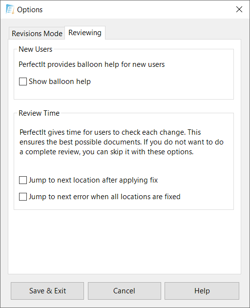 For new users, we recommend keeping balloon tips on when you first run PerfectIt in order to get used to PerfectIt’s interface. When you are familiar with it, you can turn balloon tips off.