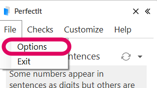 Options is found in PerfectIt’s File menu.