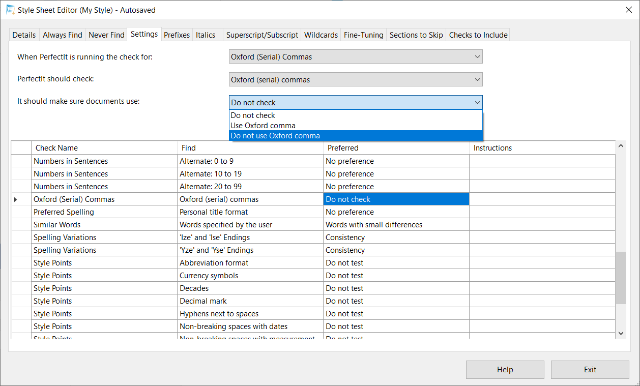 PerfectIt can be customized to check that the use of Oxford commas is consistent with the user’s specified preference.