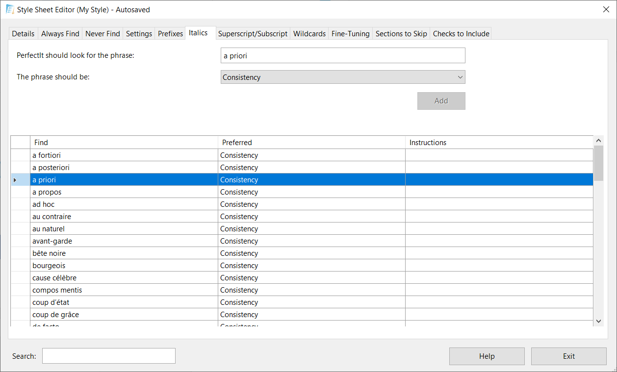 To change the term ‘a priori’ from checking consistency, find the term in the list, then click the dropdown next to The phrase should be. Choose, for example, Always in Italics, then click Apply. PerfectIt will now find all locations where that word is not italicized and suggest a fix.