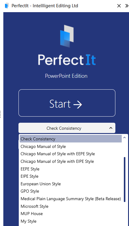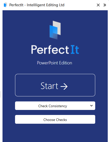 The first time you click Start run PerfectIt for PowerPoint a reminder screen will pop up.