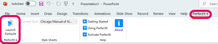 To start PerfectIt for PowerPoint, open PowerPoint and open the presentation that you want to check. In the ribbon, click the PerfectIt tab. Then click Launch PerfectIt.