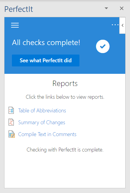 Once PerfectIt Cloud has completed the checks it allows you to run a variety of reports.
