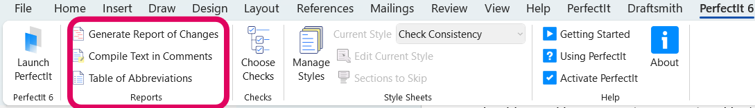 You can also access the reports from the Reports group in the PerfectIt 6 ribbon. From here you can run the reports described earlier.