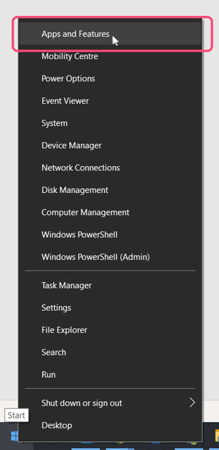 Close any Office applications you have open. Right-click on the Start button and select Apps and Features.