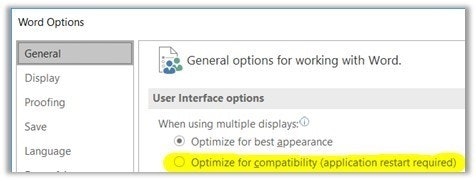 Due to a recent Microsoft update, the "Choose Tests" button in PerfectIt 3 may lead to a blank screen. If it does, please go to File >> Options >> General and change the preference shown here to "compatibility".