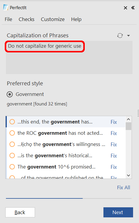 Sometimes style guides include a usage that is preferred in most instances, but an alternative that is acceptable in some cases. For example, the capitalized word ‘Government’ may be preferred when the term is used as a substitute for ‘UK Government’, but the lowercase ‘government’ may be preferred when referring to ‘government bodies’ in general. When that’s the case, you can add a note that will appear when PerfectIt locates the word. Simply type the text you want to appear into the Instructions column for that term in the Style Sheet Editor. This text will be displayed instead of the default Issue Description, as shown above.
